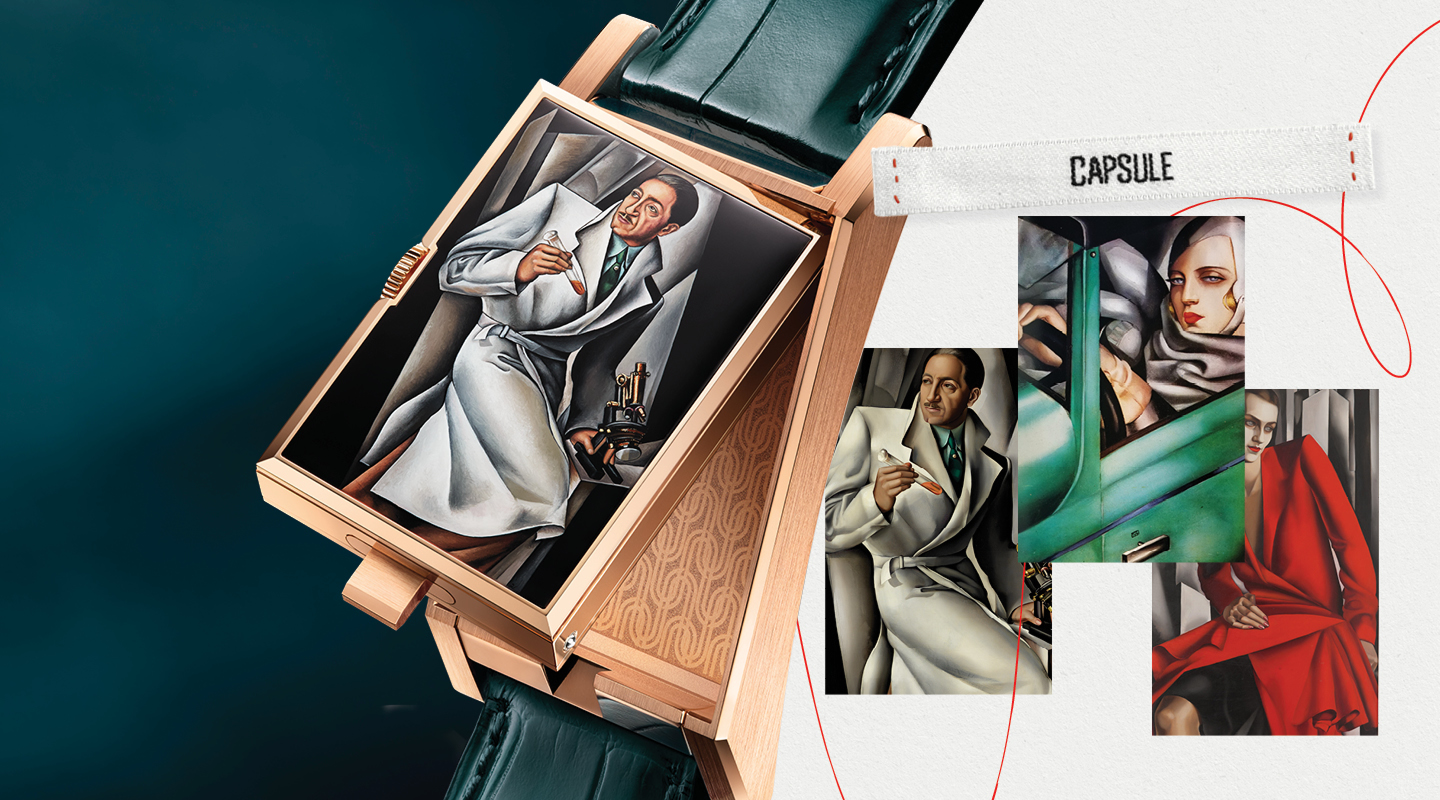 In a deep velvet teal palette, the Cabriolet De Lempicka transforms color into narrative. The reversible case reveals miniature hand-painted interpretations of Tamara de Lempicka’s artworks, where rich tones become both backdrop and subject, merging pictorial expression with the sculptural elegance of the timepiece.