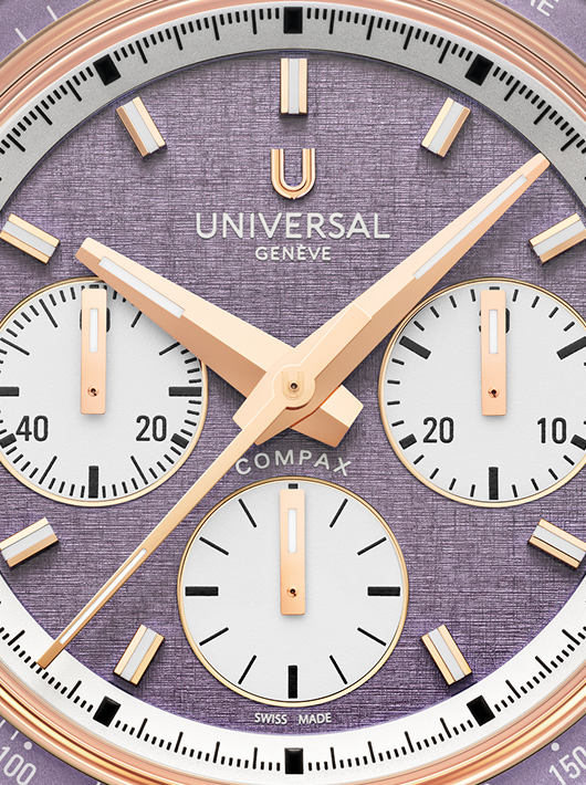 The Compax capsule editions combine Universal Genève’s chronograph mastery with modern creativity. Powered by the UG-200 movement with integrated Microtor™, column-wheel chronograph, and vertical clutch, each edition ensures precise timing and smooth operation. The ceramic bezel, tachymeter scale, and clearly defined counters enhance usability, while carefully executed finishes and subtle details create a harmonious balance of technical excellence and aesthetic sophistication.