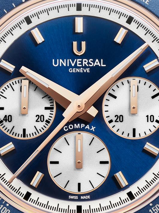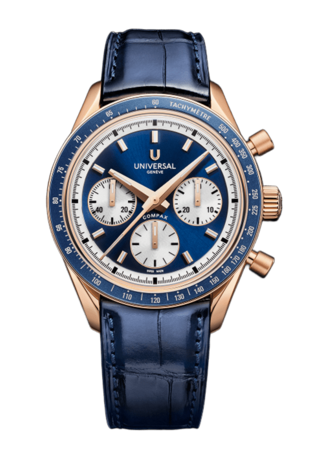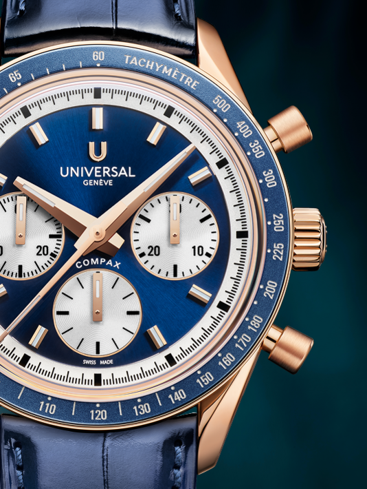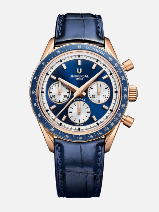 Conceived to combine performance with elegance, the Compax Prêt-à-Porter pairs the expressive design of a sporting chronograph with the technical sophistication of Universal Genève’s new UG-200 calibre. Featuring an integrated Microtor™, column-wheel chronograph and vertical clutch, the movement delivers precise, fluid operation with a “weekend-proof” 72-hour power reserve.