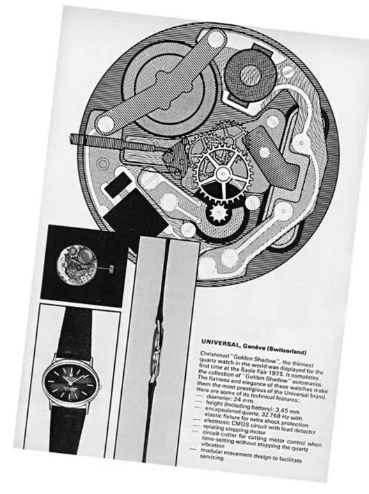 Universal Genève presents the world's thinnest automatic movement at the Basel watch fair. The caliber 66 makes its appearance on the White Shadow, Gilt Shadow and Golden Shadow, watches measuring 2.5 mm in height. The caliber 66 will hold the record for the thinnest self-winding movement until 1978.