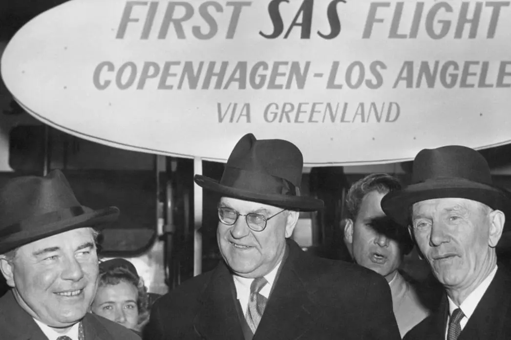 On November 15, 1954, after several trials, the first flight to Los Angeles on this new route takes off from Copenhagen. Leading journalists and three Scandinavian prime ministers - Denmark's Hans Hedtoft, Sweden's Tage Erlander and Norway's Oscar Torp - are on board the Douglas DC-6B equipped with state-of-the-art technology.