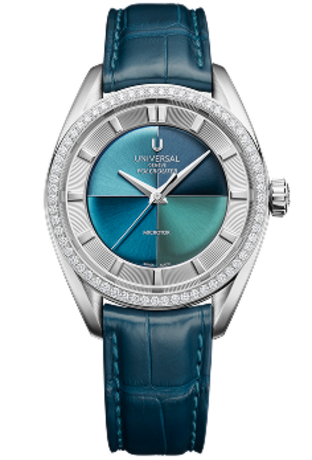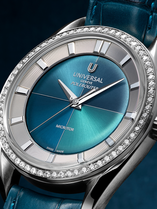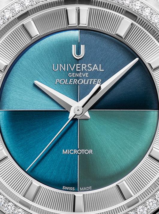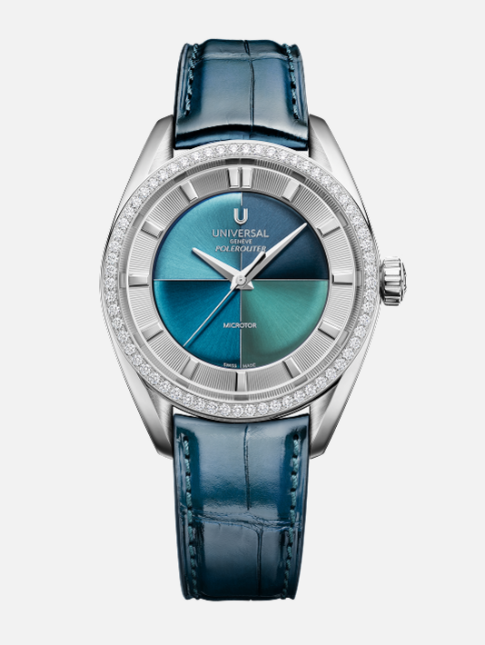 The Camaïeu editions elevate the Polerouter’s signature elegance through both color and craft. From the crosshair dial interpreted in subtle tonal quarters to the twisted lugs and diamond-set cases and bezels of some of its models, every element reflects Universal Genève’s philosophy of ennoblissement: a marriage of technical mastery and refined, artistic expression.