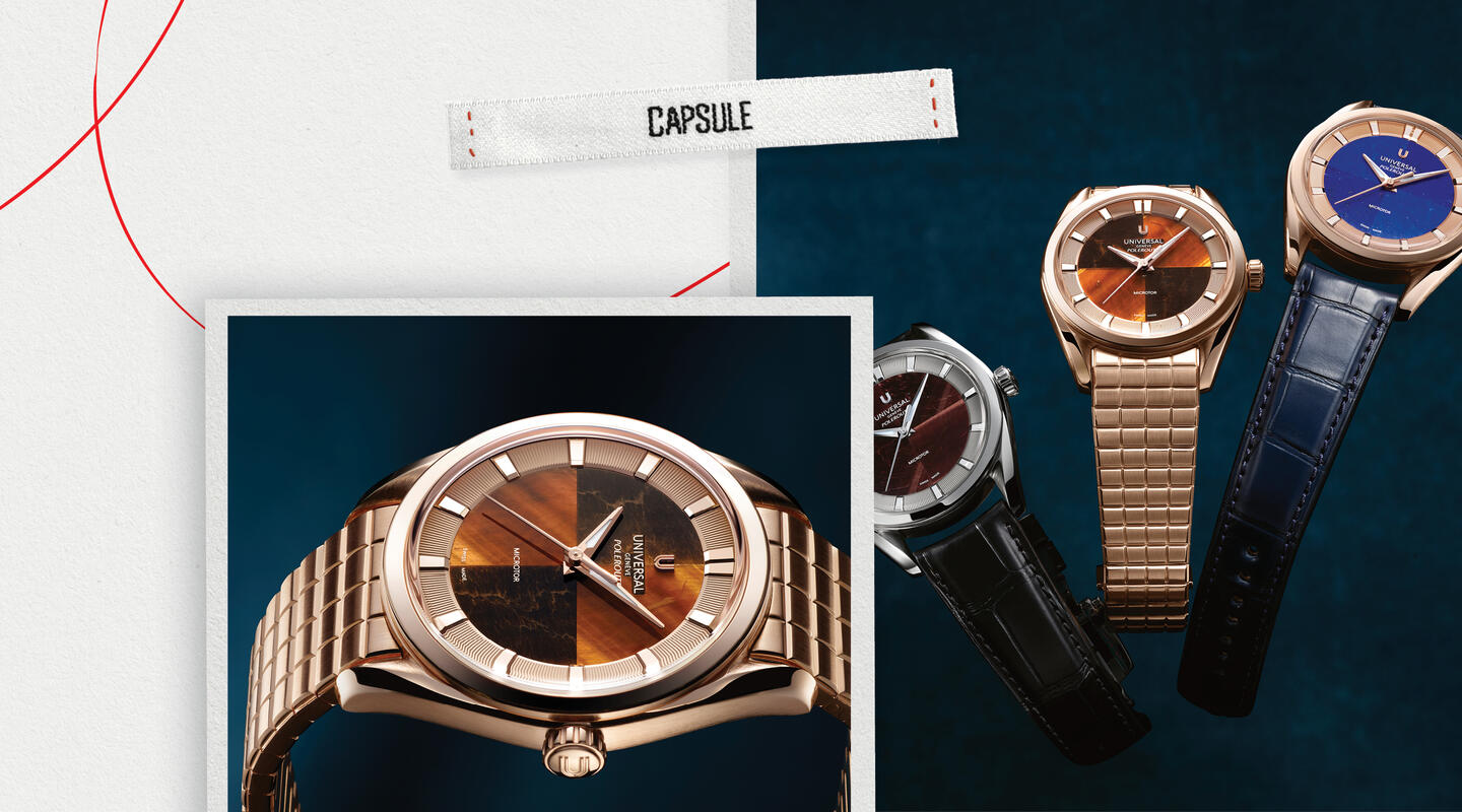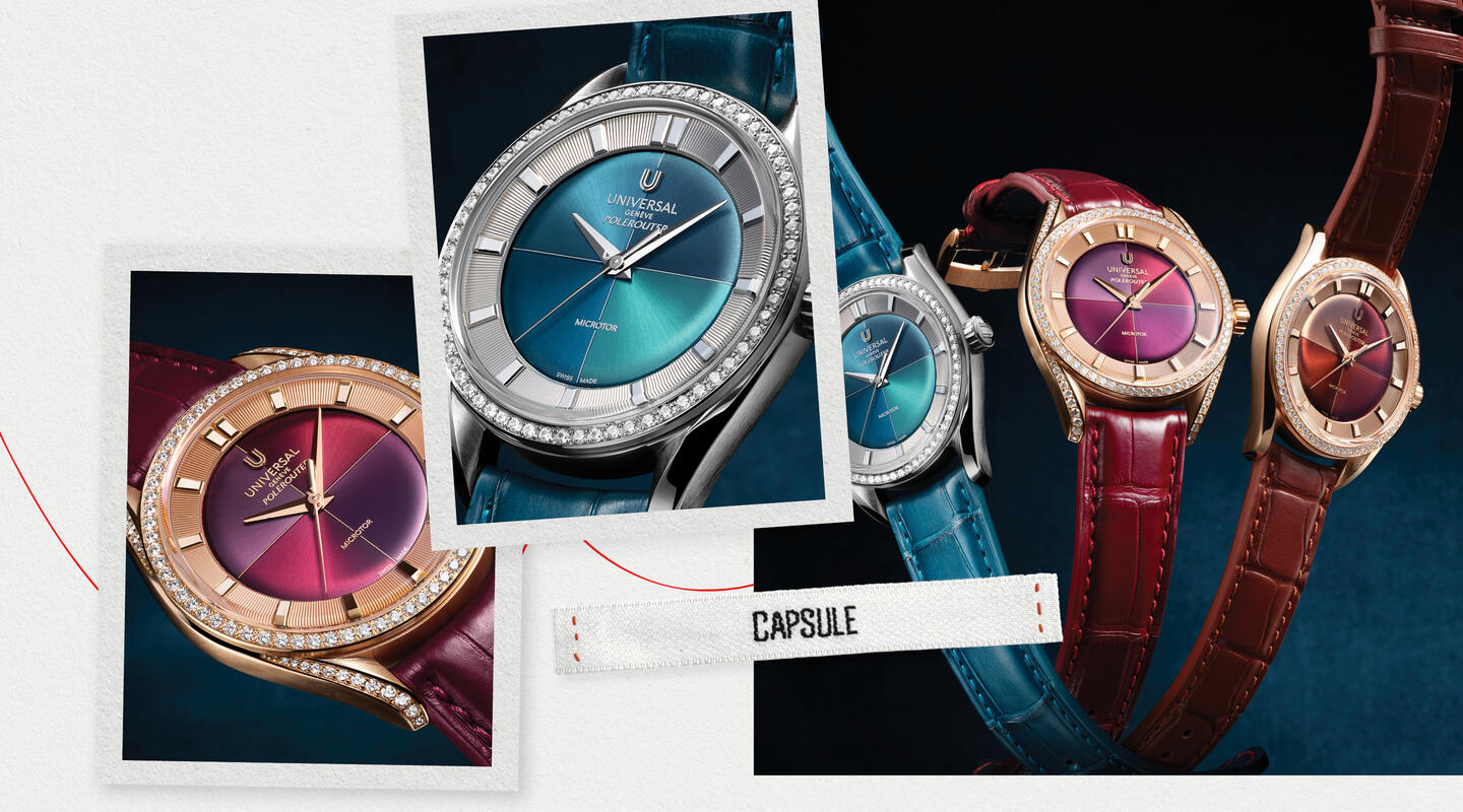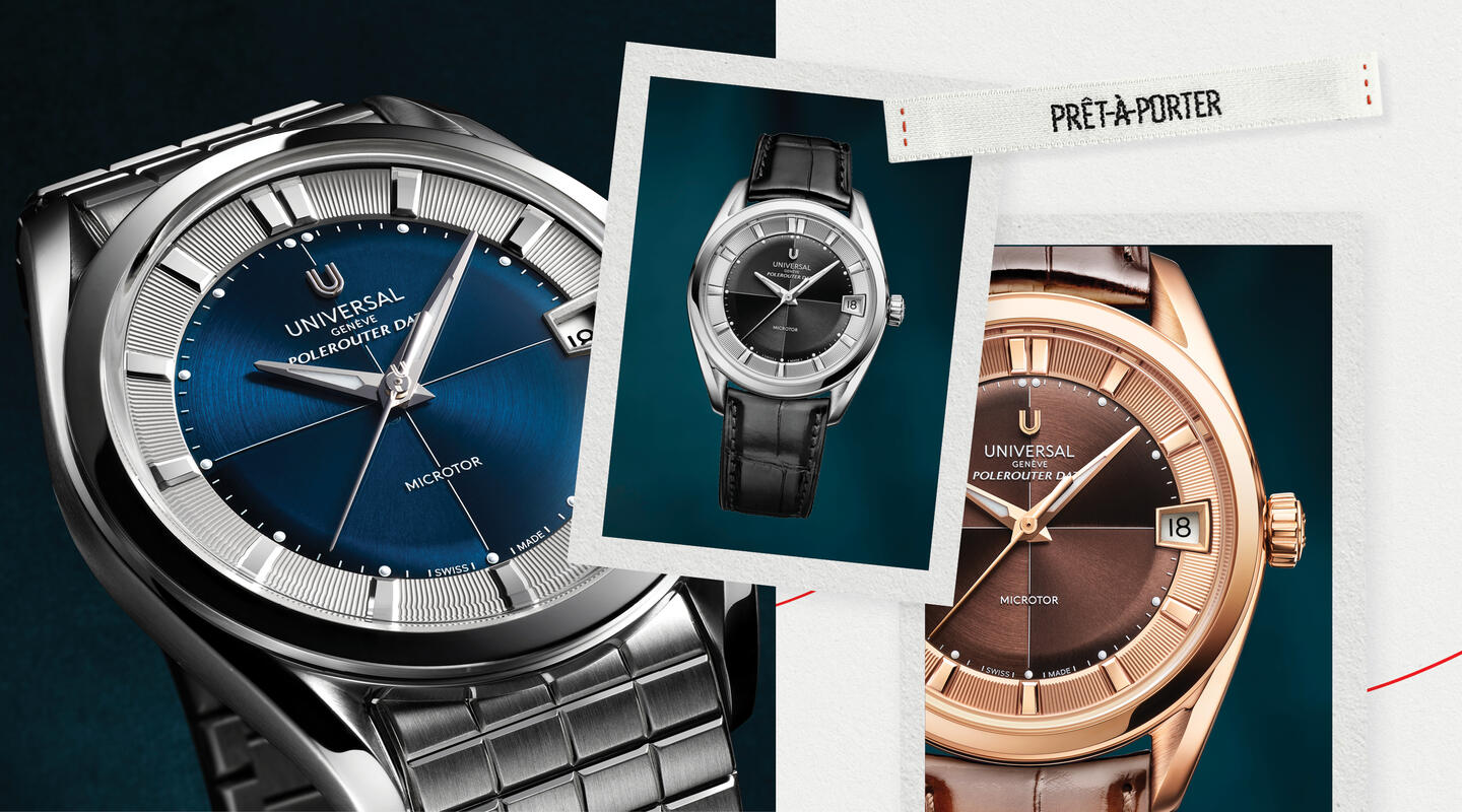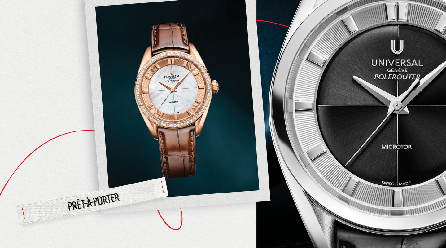 Originally designed in 1954, the Polerouter makes its comeback as a centerpiece of the Universal Genève collections. Immediately recognizable by its crosshair dial, bezel and twisted lugs, it is reinterpreted in the Prêt-à-Porter and Capsules editions.
