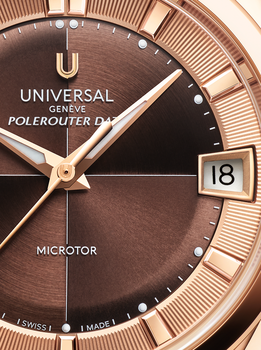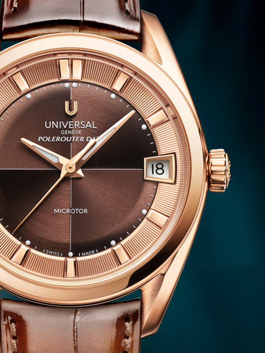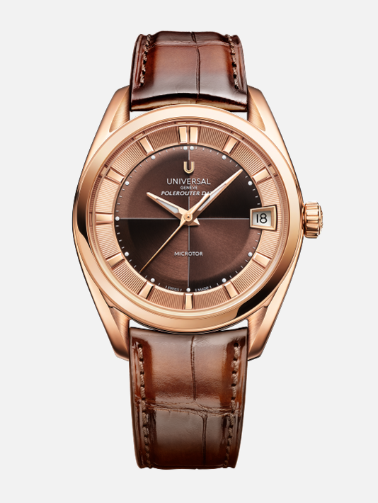 Designed for a confident everyday statement, the Polerouter Date Prêt-à-Porter 39mm balances performance with presence. Its UG-110 Microtor™ movement offers a 72-hour power reserve, while the rich interplay of textures across the dual-finish dial and outer ring adds visual depth. Every element is crafted to harmonize utility with elegance, reflecting Universal Genève’s approach to functional beauty in a slightly larger format.