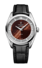 Housed in a 39 mm rose gold case, this watch highlights a tiger’s eye stone dial whose natural depth and texture are accentuated by a sunray inner bezel. Luminescent hands provide legibility, complemented by a black alligator strap.