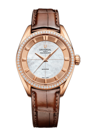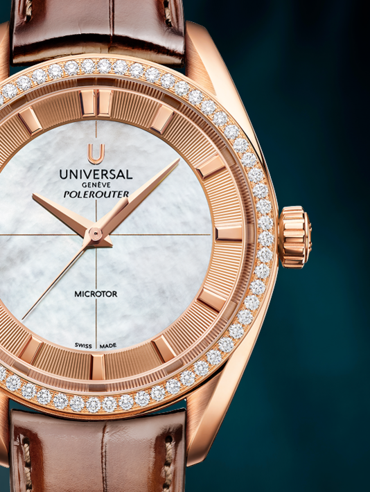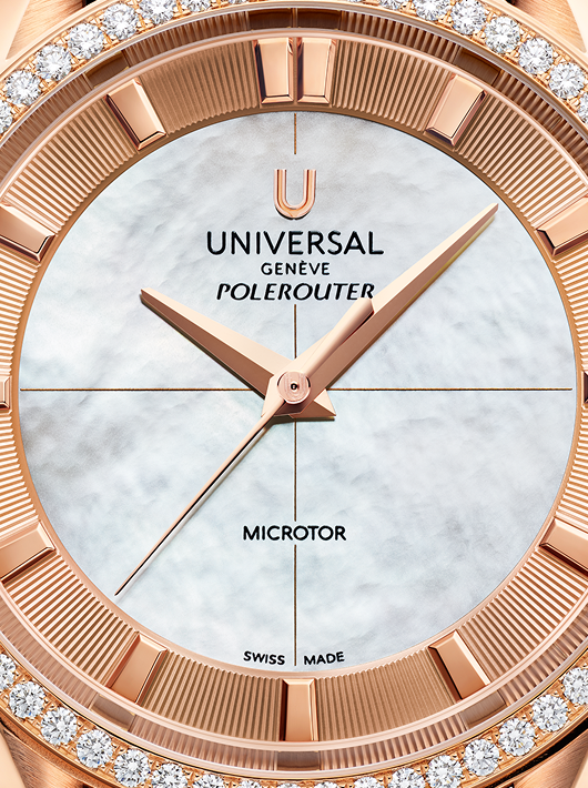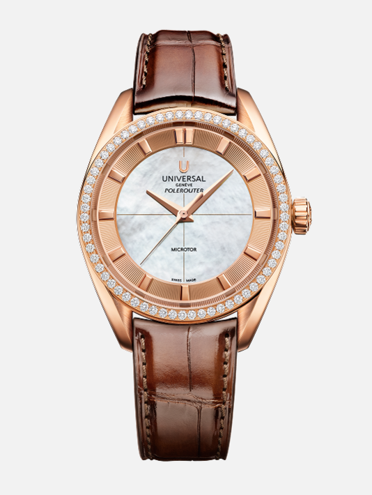 The Polerouter Prêt-à-Porter in 37mm embodies Universal Genève’s vision of functional beauty with a refined, contemporary touch. Equipped with the UG-110 Microtor™ movement, these editions pair technical precision with understated elegance. The dual-finish domed dial, subtly textured outer ring, and versatile strap and bracelet options ensure the watch performs seamlessly in everyday life while maintaining the Maison’s hallmark visual balance.