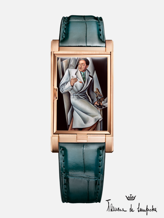 L’édition capsule Cabriolet transforme la mesure du temps en une véritable œuvre d’art de collection. Son boîtier en or rose 18 carats encadre un cadran laqué teal velours, tandis que le fond de boîte dévoile une miniature peinte à la main de l’un des trois chefs-d’œuvre de © Tamara de Lempicka (Portrait of Mrs Bush, Tamara in Green Bugatti ou Docteur Boucard), réalisée en collaboration avec Isabelle Villa.